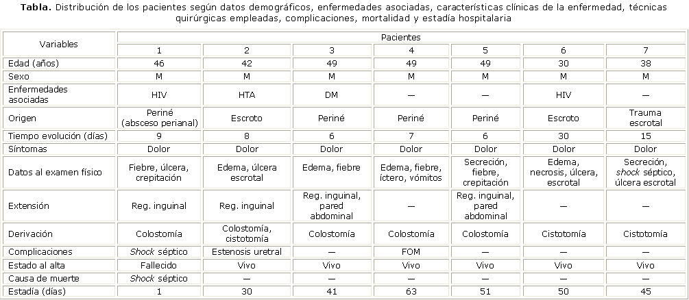 En la tabla se exponen los resultados. Todos los pacientes, del sexo masculino, tenían edad media de 43,3 años; el más joven tenía 30 y el mayor 49 años. Las enfermedades asociadas correspondieron a síndrome de inmunodeficiencia adquirida (SIDA) (2); uno de ellos desnutrido, diabetes mellitus (DM) (1) e hipertensión arterial (HTA) (1). El origen fue perineal en cuatro pacientes y escrotal en tres; (uno de ellos traumático) (Fig. 1). En la imagen se muestra la amplia zona de desbridamiento perineal y escrotal. La piel del ano está conservada, lo cual constituye una característica de la enfermedad. Tres enfermos, referían antecedentes de fístulas o abscesos perianales. El tiempo de evolución mínimo fue de 6 días y el máximo de 30. Este último refería aumento de volumen, dolor y secreción escrotal, pero no fue capaz de informar tiempo exacto, de agudización de los síntomas.