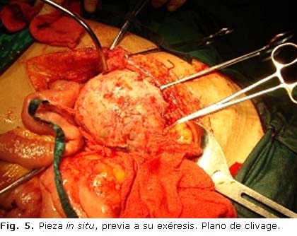 Se opera y se encuentra una gran masa pseudo encapsulada muy adherida a los planos vecinos que crece hacia la raíz del mesenterio, desplaza a todo el intestino delgado y grueso del hemiabdomen izquierdo hacia adelante y al riñón izquierdo hacia abajo. No se encuentra un plano de definición entre el tumor y la gerota (Fig. 4) Desciende hasta la pelvis mayor y no se identifican órganos sexuales residuales. No infiltración del uréter. A pesar de ser muy difícil la disección y ser bien vascularizada la lesión, se logra su exéresis (Fig. 5) La paciente evoluciona satisfactoriamante y es dada de alta para seguimiento oncológico a los seis días y al mes. La paciente reside en el extranjero por lo que su seguimiento no ha sido posible.