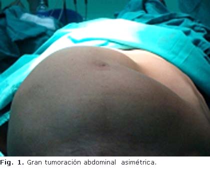 Al examen físico del abdomen se constata una gran tumoración que abomba de forma asimétrica y ocupa desde el hipogastrio hasta el epigastrio siendo más alta del lado derecho donde ocupa también el hipocondrio y flanco derecho (Fig. 1). A la palpación, se aprecia una tumoración de consistencia firme, no desplazable, no dolorosa a la presión.