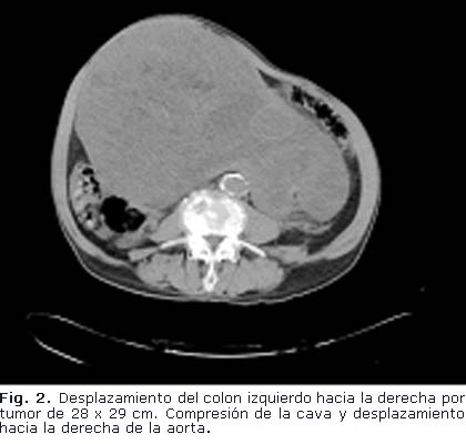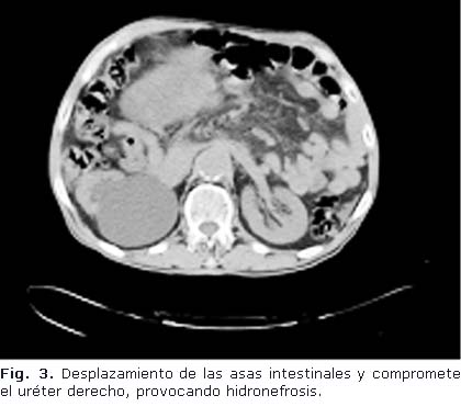 Tomografía Axial Computadorizada con contraste vía oral y endovenosa: Se aprecia gran masa tumoral compleja, que se extiende desde la excavación pélvica, donde comprime el recto hacia la derecha y la vejiga hacia delante (Fig. 2 y 3), desplaza las asas intestinales y compromete el uréter derecho, provocando hidronefrosis. El tumor mide aproximadamente 28 x 29 cm. Aorta ateromatosa, no lesión focal en hemiabdomen superior. No líquido libre en cavidad. La próstata no se logra identificar.