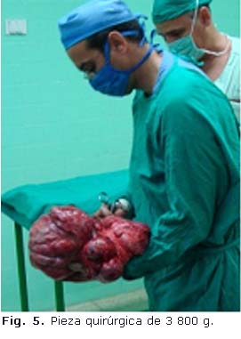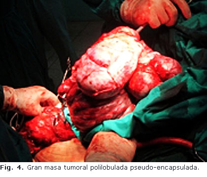 Al paciente se le realiza una laparotomía amplia a través de una incisión xifo-pubiana. Se encuentra una gran masa tumoral polilobulada (Fig. 4), encapsulada, que ocupa la mayor parte de la cavidad y que rechaza las asas intestinales delgadas hacia el hipocondrio izquierdo. Esta tumoración que crece desde la pelvis (la cual ocupa) eleva la vejiga, con la cual guarda una íntima relación, crece por el retroperitoneo hacia el mesenterio desplazando recto, colon sigmoides y descendente hacia la fosa iliaca derecha con gruesos vasos varicosos en su mesenterio, colapsa la cava y vasos iliacos. Es de apreciar que aunque la tumoración no es muy vascularizada, si está rodeada de una gran circulación colateral varicosa retroperitoneal. El uréter derecho, con gran dilatación por encima de la tumoración esta englobado por su pseudo-cápsula que se logra liberar. Finalmente se separa de la vejiga hasta descender hasta lo que parece ser la próstata terminando con su exéresis posterior dicho proceder (Fig. 5).